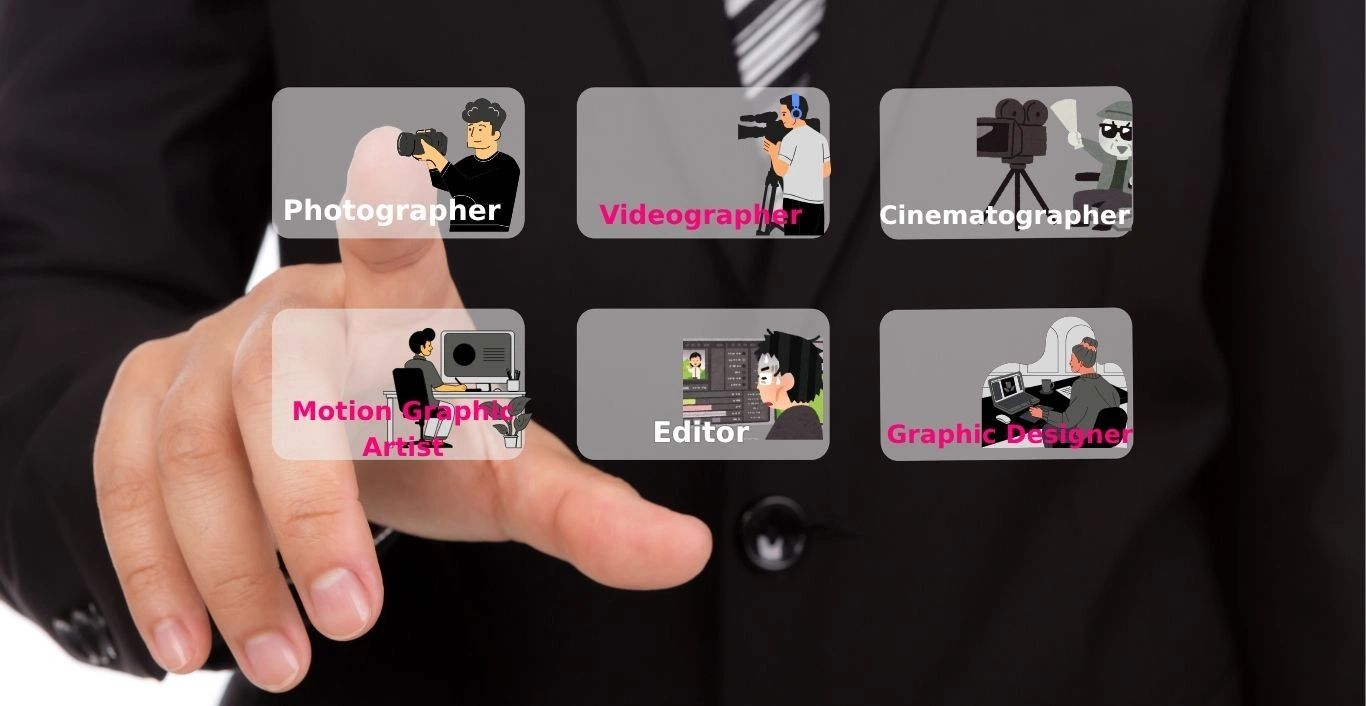Select the specific service category that aligns with your project requirements, whether it's photography, videography, cinematography, graphic design, editing, or motion graphics.