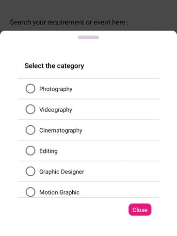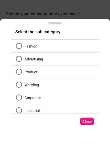 After selecting your required category, pick the subcategory that best fits your project. Ex: Fashion, Advertising, Product, Wedding, Corporate, Industrial, Architectural, or Event photography. This helps you find the right talent for your needs.